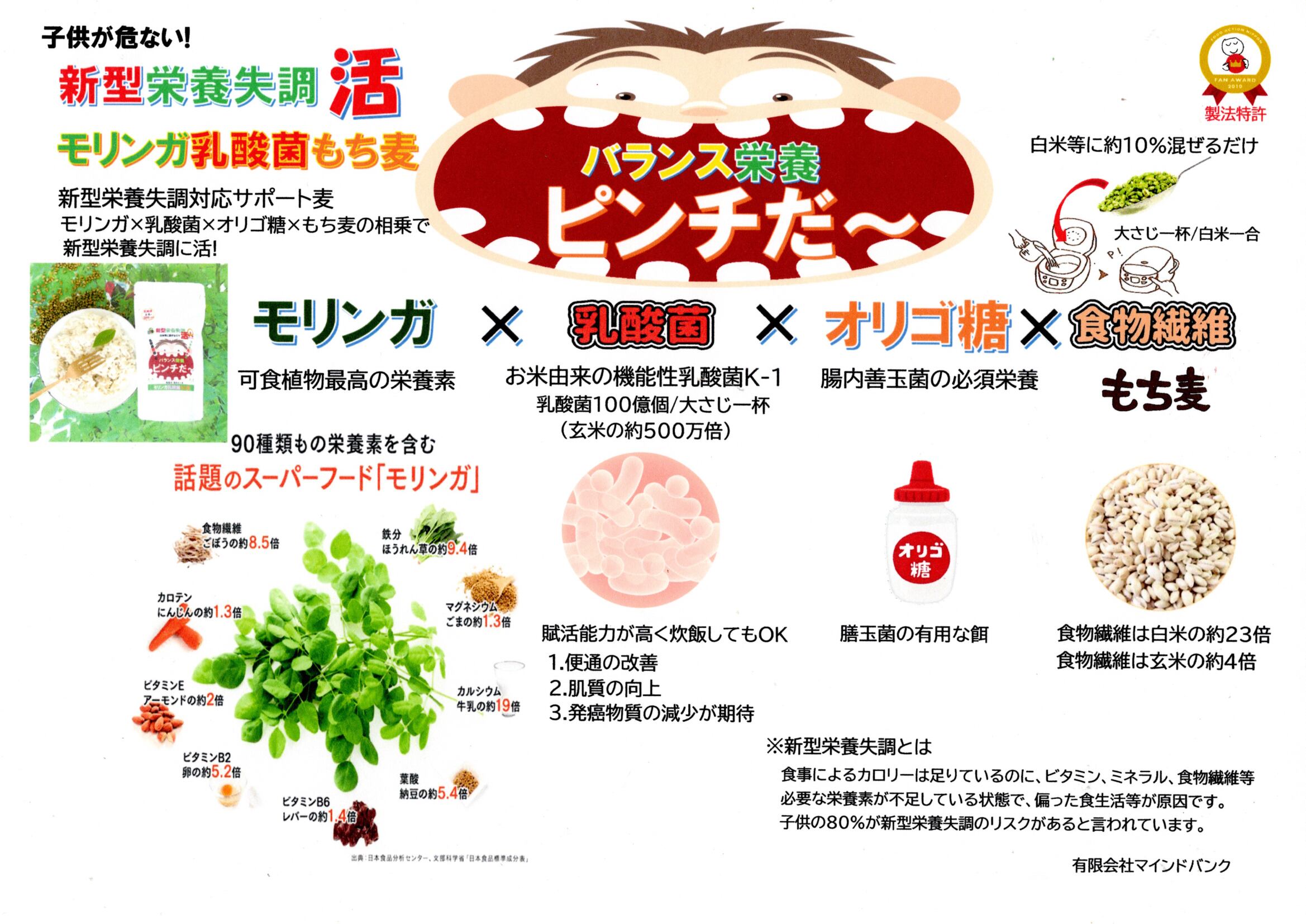 お母さん大変です!なんと、現在の子供の80%が「新型栄養失調」のリスクがあると言われています。その対応として健康と環境に嬉しい スーパーフードのモリンガと植物性乳酸菌K-1と食物繊維が豊富なもち麦を加工融合した「モリンガもぐもぐ」モリンガ乳酸菌もち麦の開発に至りました。